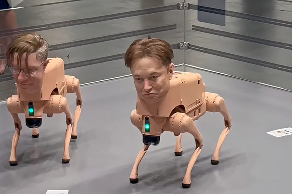 Mike Winkelmann enters the spotlight of Art Basel Miami Beach with a pack of metal mutts that combine the uncanny valley with a biting punch at contemporary power brokers. Regular Animals, a squad of eight robotic canines wandering a gated enclosure in the fair’s new Zero 10 digital art section, was launched this week by the digital artist from Charleston, South Carolina, known as Beeple. Each has a lifelike silicone head sculpted after a titan of industry or creativity, including Elon Musk, Jeff Bezos, Mark Zuckerberg, Pablo Picasso, Andy Warhol, and even two versions of Winkelmann himself.