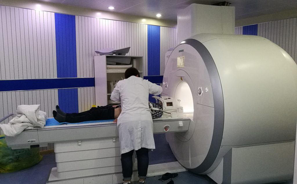 Patient being positioned for MR study of the head and abdomen. — Image by Ptrump16. CC BY-SA 4.0